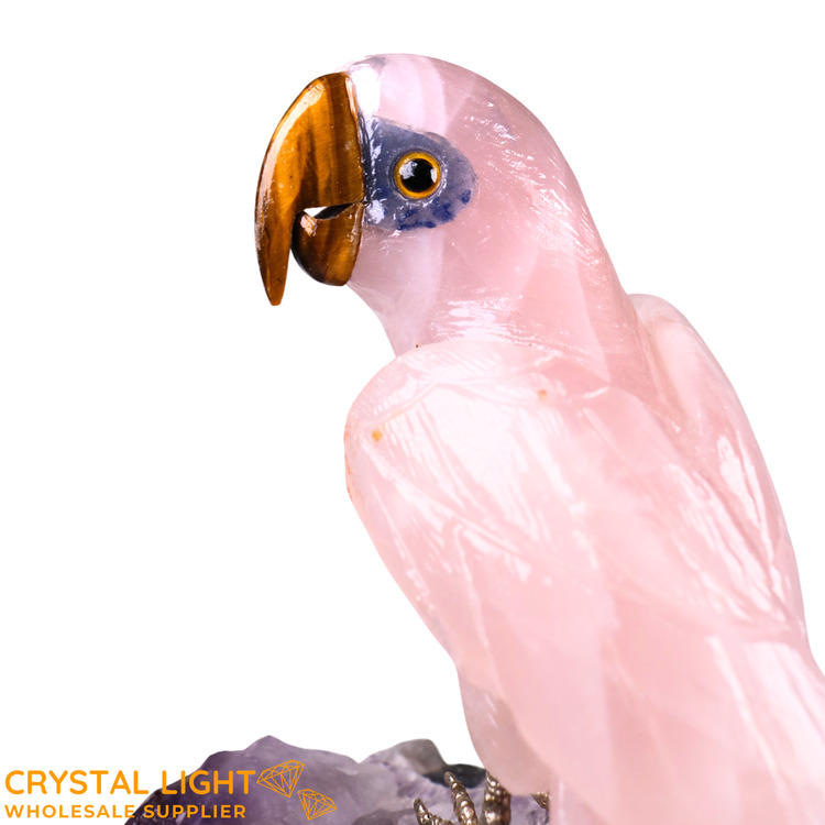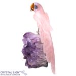 This beautiful Parrot Sculpture has an array of different crystals used to form the different colourings on the Parrot. The feet are mounted onto the beautiful amethyst druse piece, making this an incredible statement piece for your space.