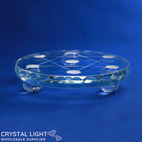 Glass plate with engraved hexgram shape to hold spheres, eggs, tumble stones etc.